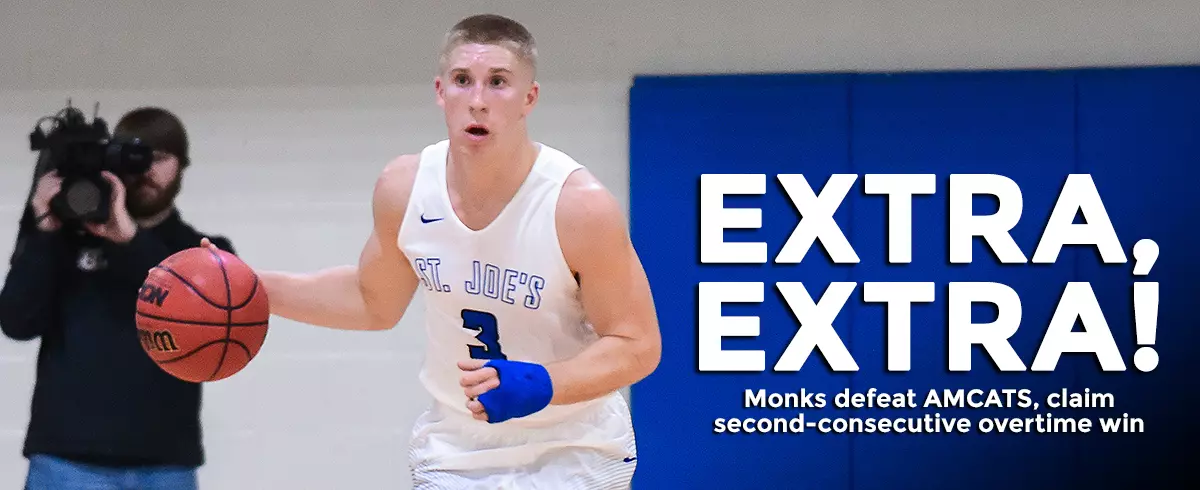 St. Joe's held a 53-48 cushion after junior forward Aaron Hall (Haverhill, Mass.) converted a layup with 7:44 remaining in regulation, but the AMCATS knotted the contest with five quick points from senior guard David Jean-Louis (Miramar, Fla.) during the following minute of play. The conference counterparts essentially traded buckets until SJC junior forward Quinn Richardson-Newton (Saco, Maine) hit a jumper, tying the contest at 61-61, with 2:58 left. The two-pointer proved to be the final shot made during regulation, as the Monks and AMCATS combined to go 0-8 from the field the rest of the way.