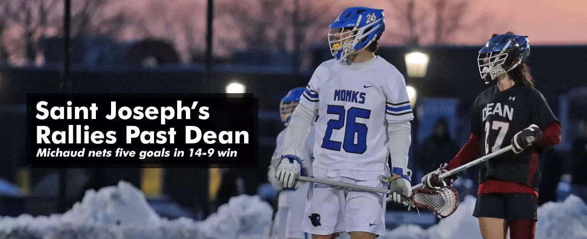 STANDISH, Maine – Saint Joseph's College (6-7, 3-3 GNAC) rallied from a three-goal deficit with a 7-0 scoring run to get past Dean College (7-4, 3-3 GNAC), 14-9, in a hard fought Great Northeast Athletic Conference (GNAC) men's lacrosse contest at the SJC Athletics Complex on Tuesday evening.